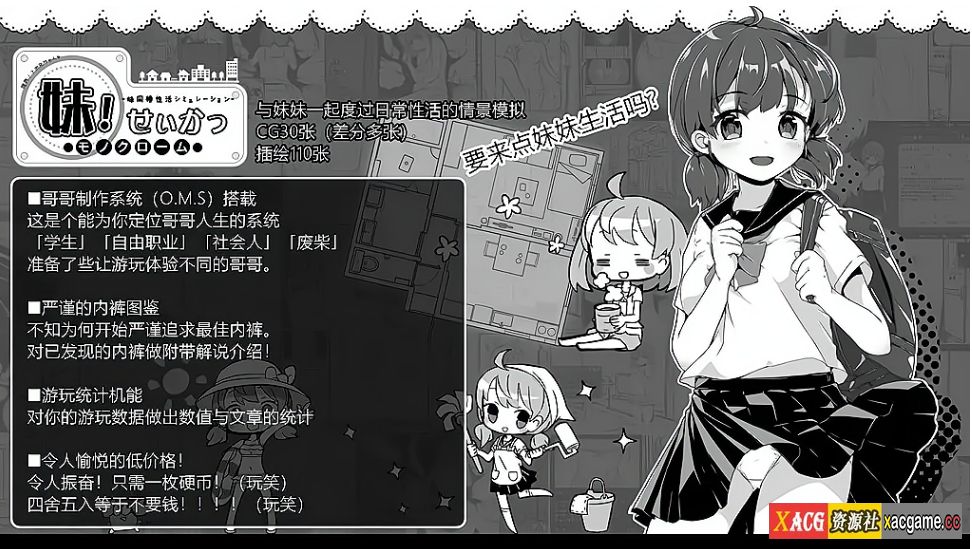这是由【いぬすく】社团发布的一款无敌爆款SLG互动游戏!玩法和家出少女类似,不过回的妹妹不是捡来的,而是真正的妹妹!游戏虽然是以黑白单色CG+日常抽象背景搭建~日常活动的Q版CG简直萌化了宅男之心,怪不得那么多人买!该社保CG场景一点都不抽象,为了大家福利,H方面画得极其精细而社保!而且黑白的好处在于作者可以把上色的功夫花到了更精细的游戏细节上~让这款游戏的内容和玩法更加丰富和又代入感!